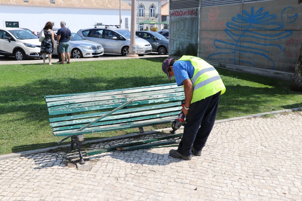Мужик ремонтирует лавку: