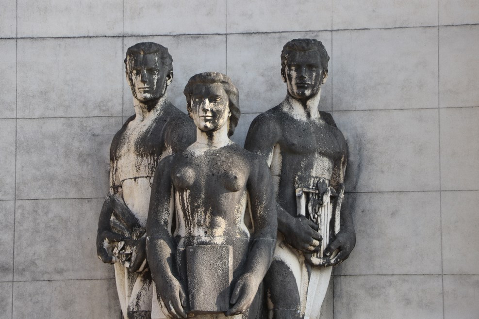 Перед входом расположены скульптуры, наверное, студентов. Все они, по непонятной причине, обнажены до торса: