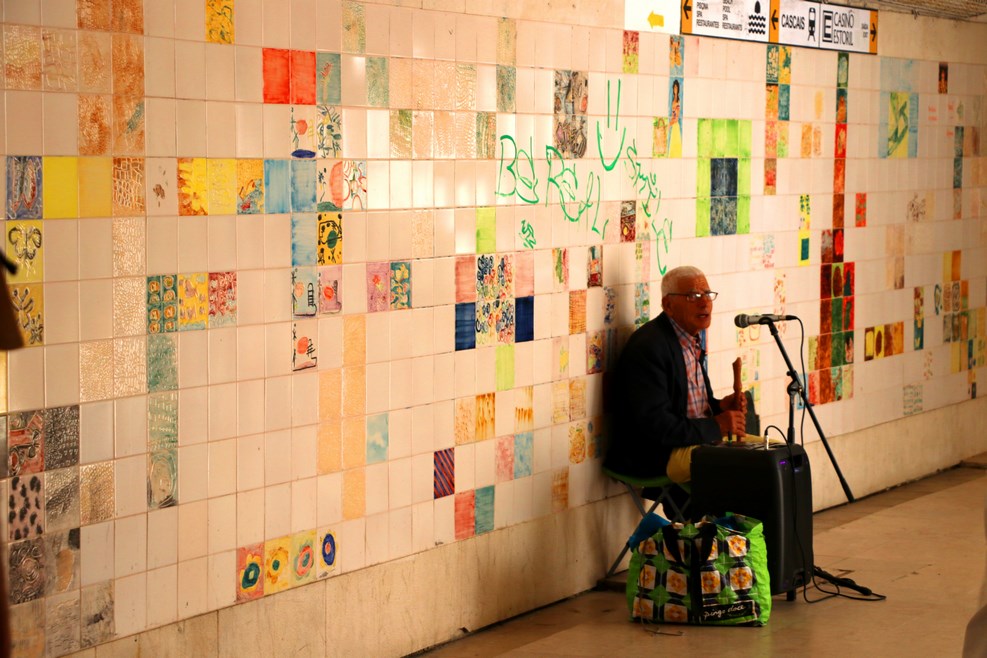 Проходим под дорогой через подземный переход, который хаотично украшен цветными плитками: