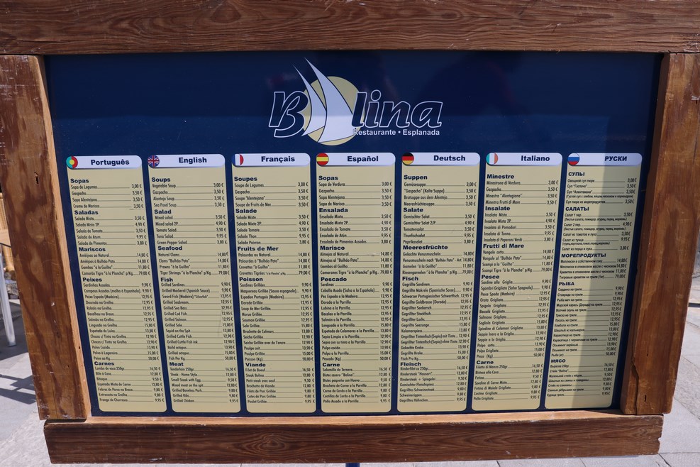 Основные посетители тут, судя по меню, Португальцы, Англичане, Французы, Испанцы, Немцы, Итальянцы и … Русские (щелкните по меню, чтобы посмотреть на цены):