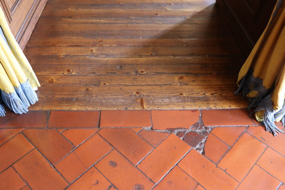 Покрытие пола – дерево и плитка. Удивило меня то, что в замке его никак не защищают от воздействия обуви: