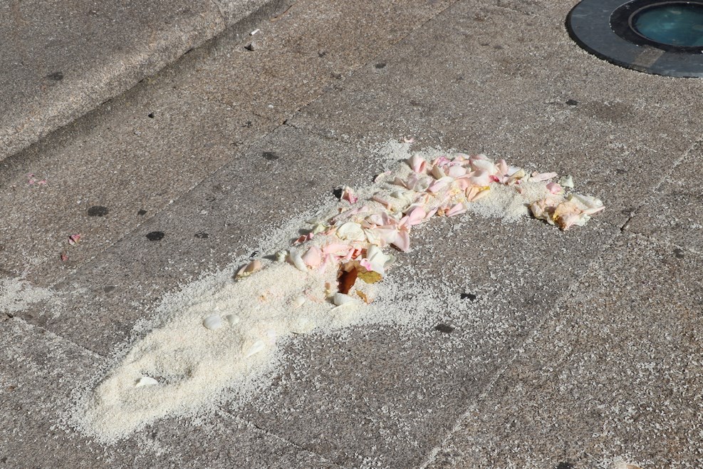 На плитке рассыпан рис с лепестками цветов. Предполагаю, после свадебного торжества: