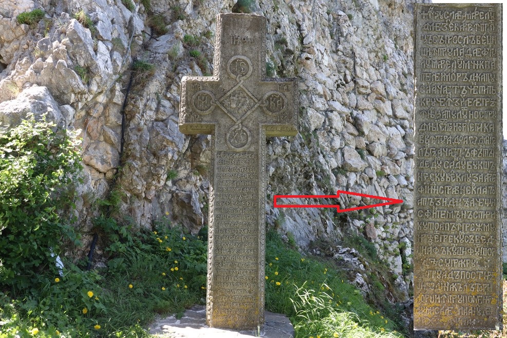 Старый крест около входа. Буквы на нем очень напоминают кириллицу: