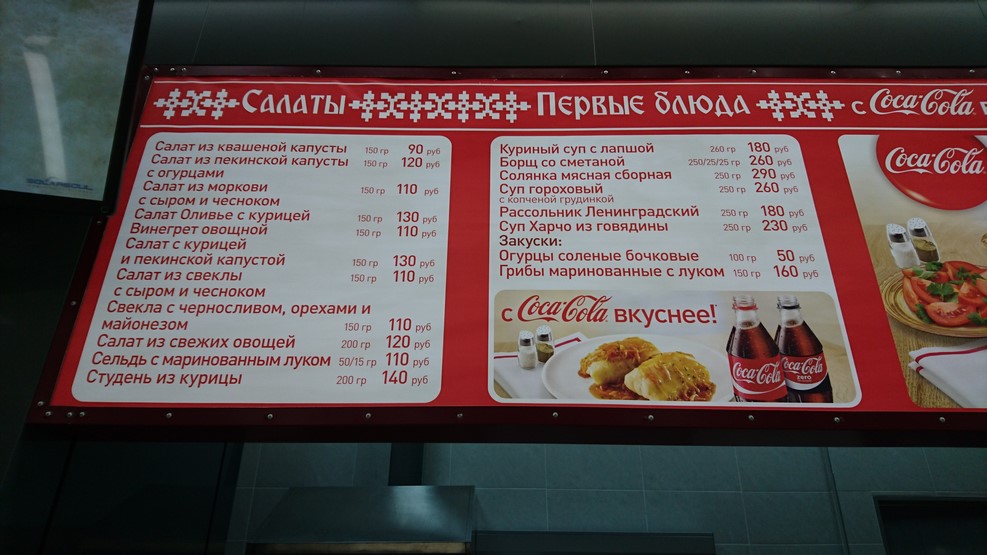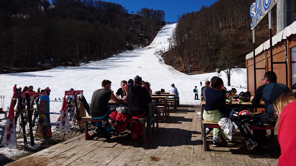 Еда на склоне стоит не дешево, но нас спасало большое количество ресторанов около гостиницы. В день примерный расход на еду на двух человек составлял 1000-1500 рублей. Так же можно питаться в столовых, там отличная домашняя еда и большие порции, уровень цен: