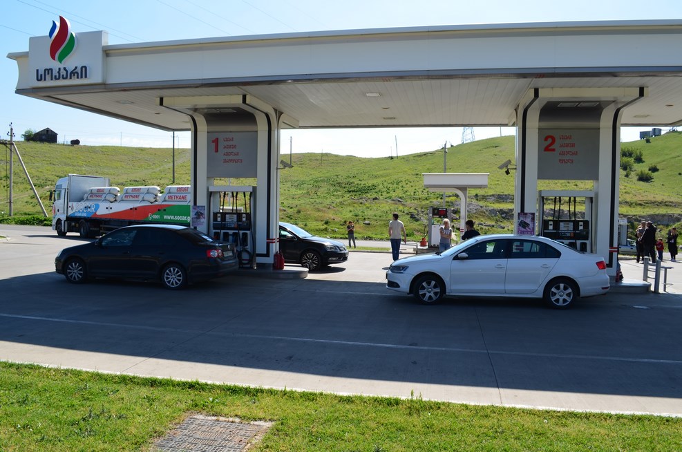 Перед границей встали на заправку, потому что в Грузии бензин дешевле. Это последняя заправка на трассе, где нам удалось заправиться, рассчитавшись картой. В Армении расплатиться можно было только наличкой: