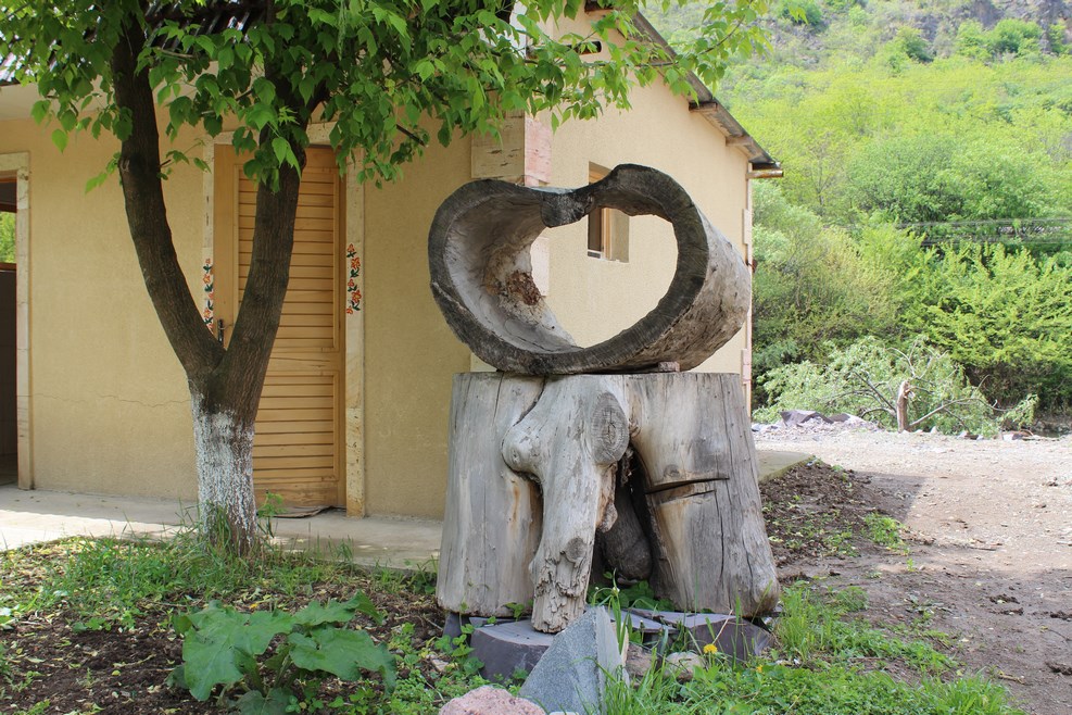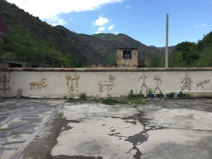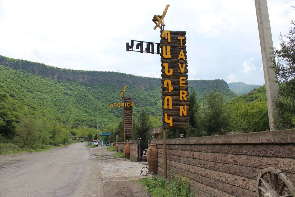 Сразу за границей мы остановились покушать. В Армении банковскими картами в ресторанах невозможно расплатиться точно так же, как и на заправках, но зато все тут охотно берут российские рубли. Оформление ресторана: