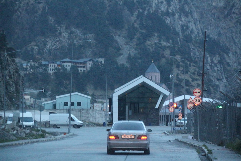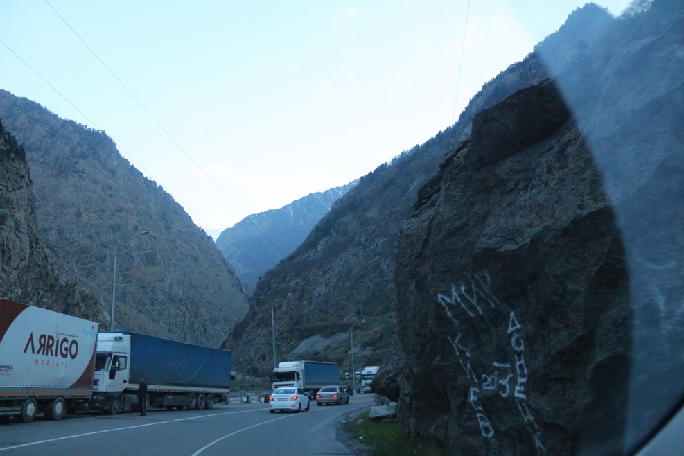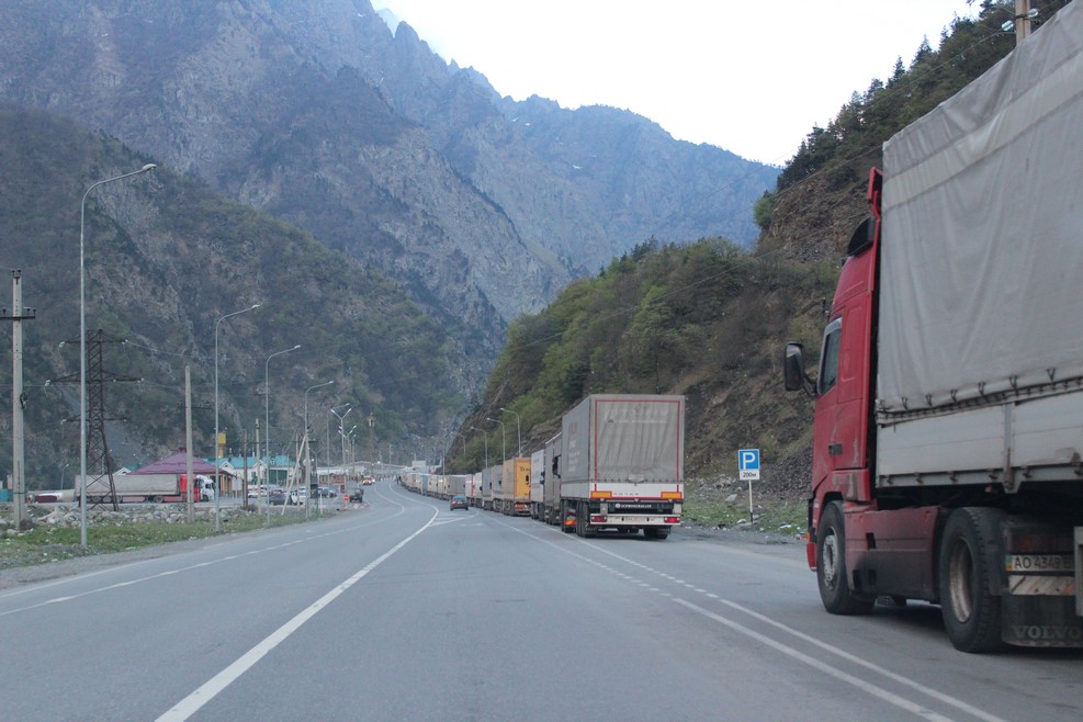 Через 40 километров от Владикавказа мы были уже на границе. По традиции объезжаем огромную очередь из грузовиков: