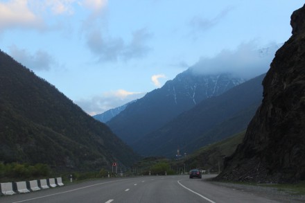 На грузинском КПП все пассажиры вышли из машины и проходили границу в отдельном коридоре (такое я первый раз увидел при прохождение финской границы в прошлом году). Машины с водителями проходят границу обычным порядком. Необычно стало то, что багажник машины досматривать не стали. Кроме того, пограничник, который ставил штамп в паспорт, спросил, есть ли у меня в машине георгиевские ленточки. Ленточек у меня не было, и я поехал дальше. Грузинскую часть Военно-Грузинской дороги мы проехали в темное время суток, поэтому эту часть дороги я покажу Вам чуть позже (на обратном пути мы записали видео на регистраторе). Заранее только скажу, что эта часть дороги в целом нормальная, однако есть два небольших участка совсем без асфальта. Вот в таких боевых условиях Олькина джетта встретила свой «111111» юбилей пробега: