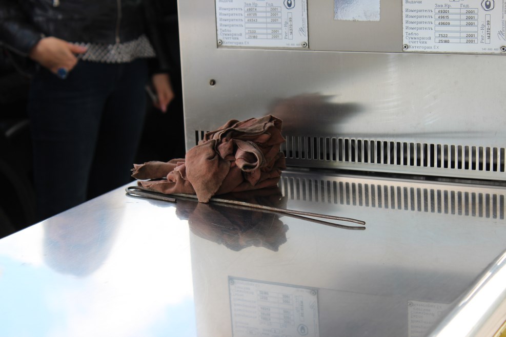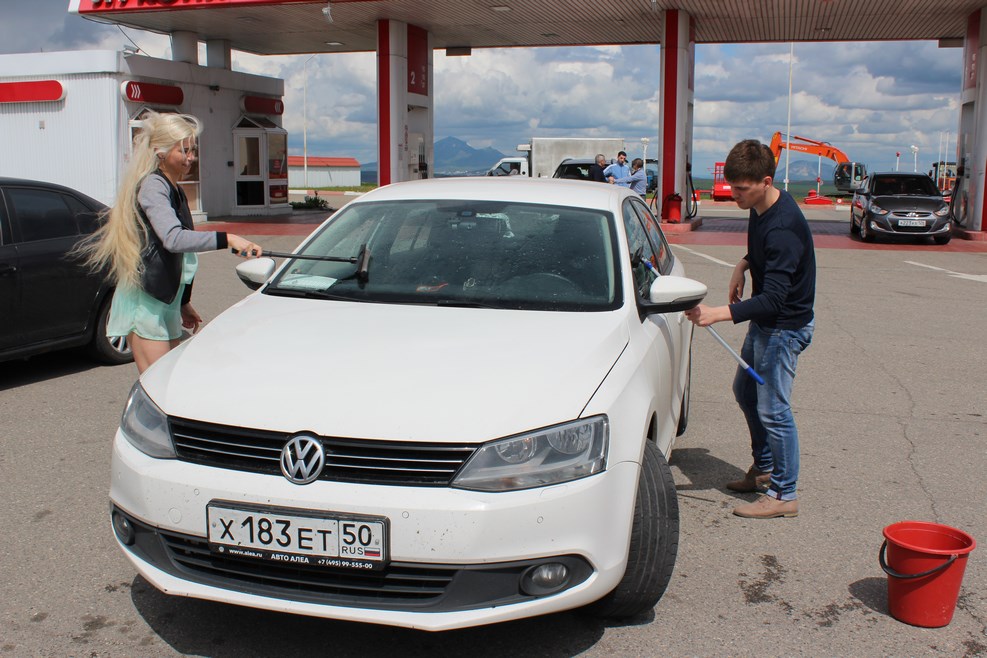 Тут мы последний раз заправились перед границей с Грузией (в России бензин дешевле). Я первый раз увидел, что на заправке есть тряпочка, что бы убирать капли бензина с кузова, которые попадают на него во время вытаскивания пистолета: