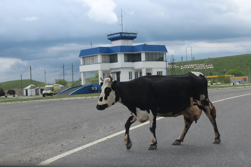 Коровы знают, где безопасно перейти дорогу. Эта переходит около поста ГИБДД под присмотром инспекторов: