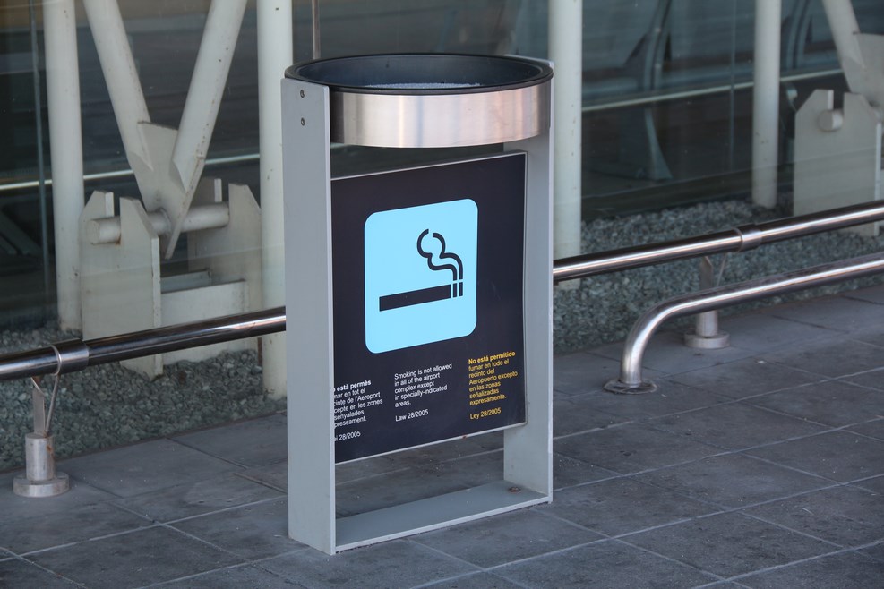 В отличие от многих европейских аэропортов, где оборудованы специальные кабины для курящих, тут курят прямо на улице. Урна для окурков: