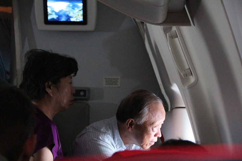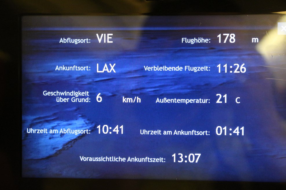 Через полтора часа мы уже сидели в самолете, который должен был нас доставить в Лос-Анджелес. Информационное табло в спинке переднего сидения показывает, что время вылета 10:41, прилетим мы в 13:07 того же дня, хоть и лететь будем 11 часов 26 минут: