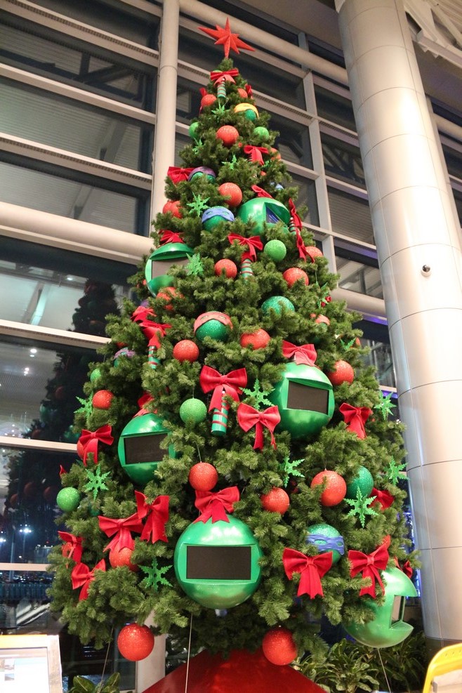В аэропорту шарики на елке напоминают шлем космонавта: