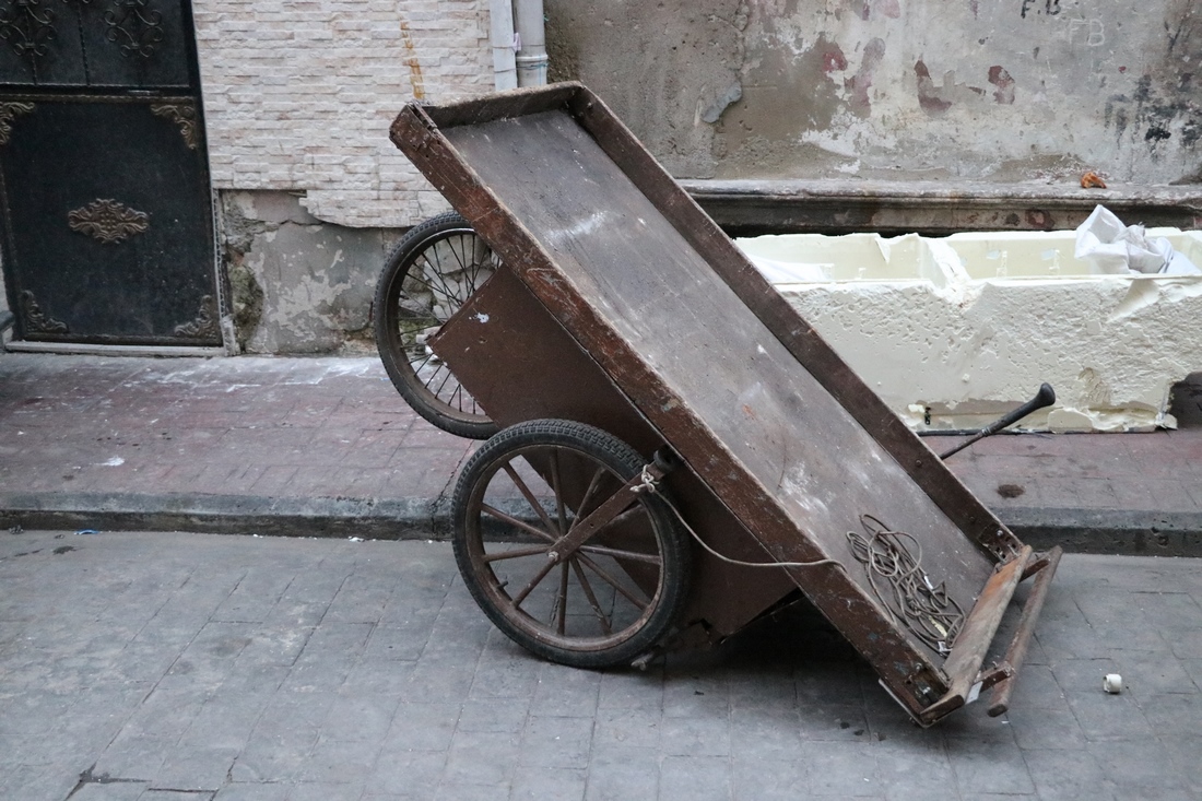 А это перевозка мусора. Мужик пытается наклонить повозку для начала движения: