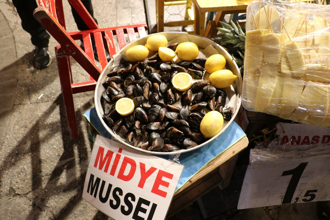 Мидии, а справа в пакете кусочки ананаса на палочке за 1.5 лиры: