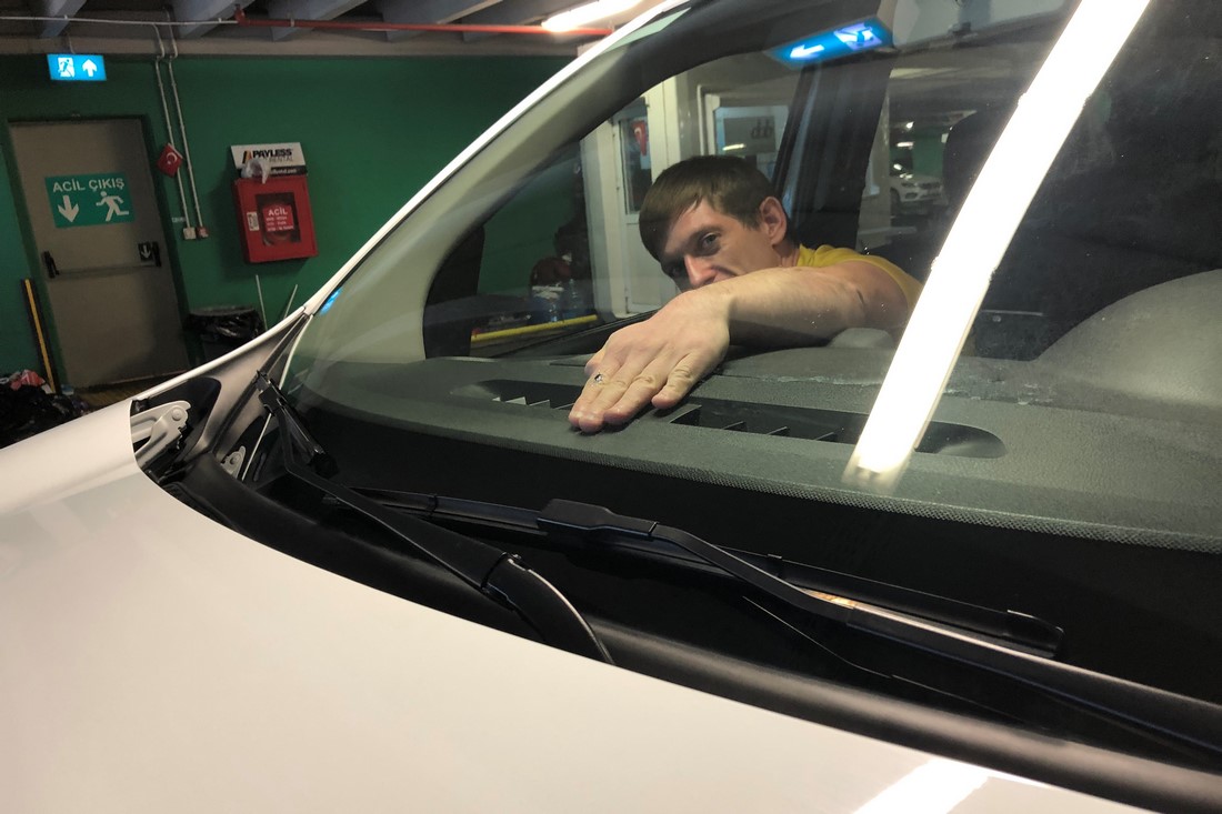 Леша показывает маленький скол сотруднику, который сдавал нам машину: