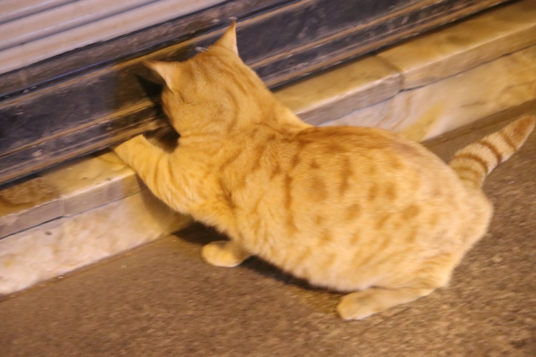 Котик что-то пытается достать: