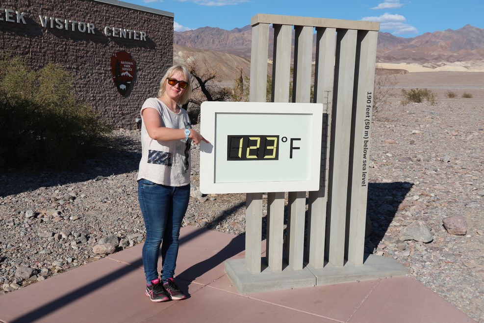 И вот мы достигли самой низкой точки в парке, которая находится на уровне 58 метров ниже уровня моря. Градусник показывал +50 градусов по Цельсию: