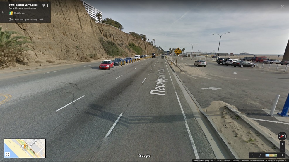 Тут вообще приходится поворачивать через дорогу, которая на карте обозначена как хайвэй (взято с гугл-карт, поворот на стоянку пляжа «Санта-Моника»):