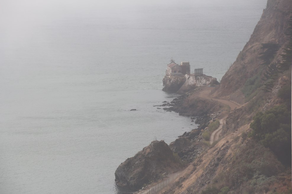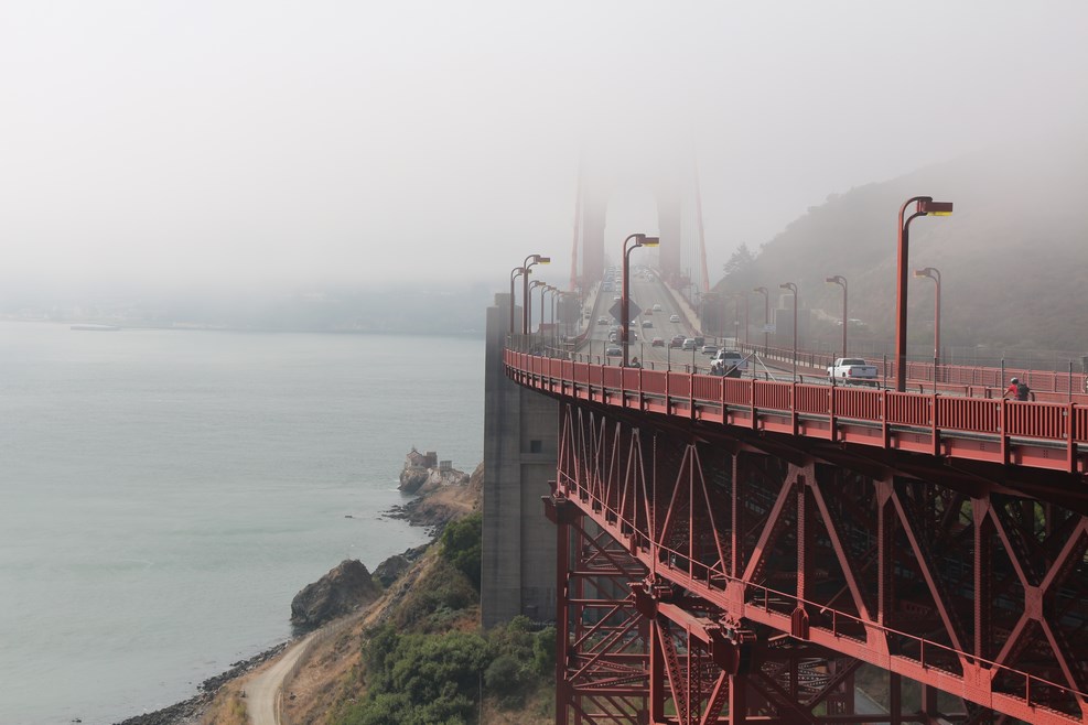 С ветром нам не повезло, мост скрывался под толстым слоем дымки: