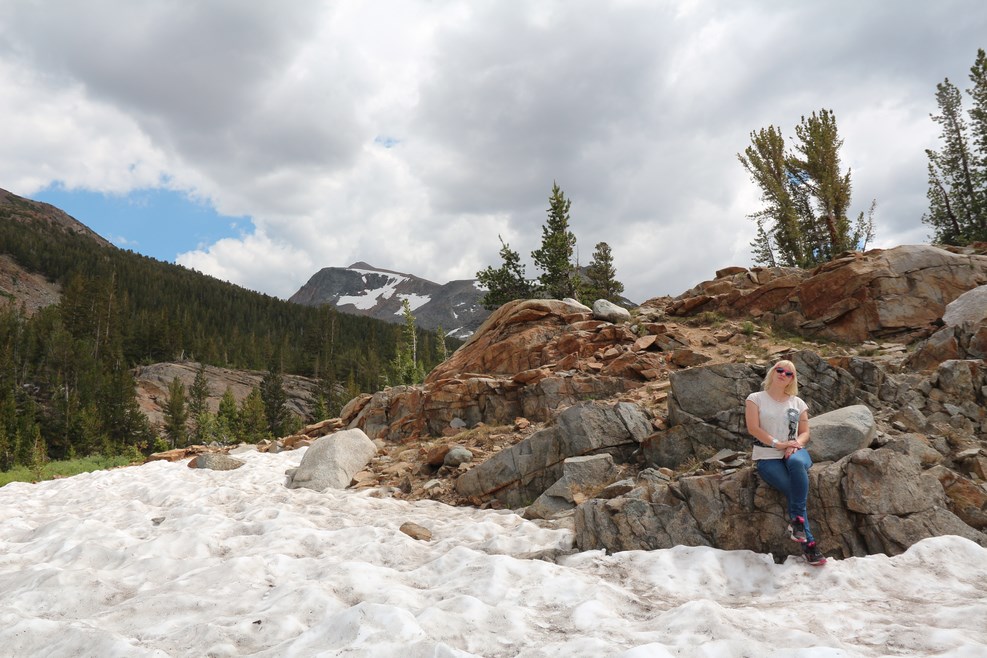 Удивительна природа Америки, еще 4 часа назад мы изнывали от жары в 50 градусов, а сейчас я спокойно медитирую сидя на снегу летом: