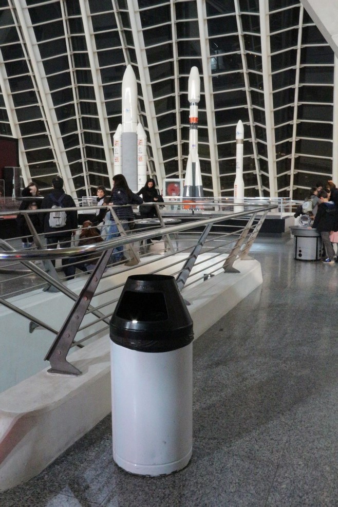 В огромном помещении собрали кучу всего. Урна, стилизованная под нос ракеты: