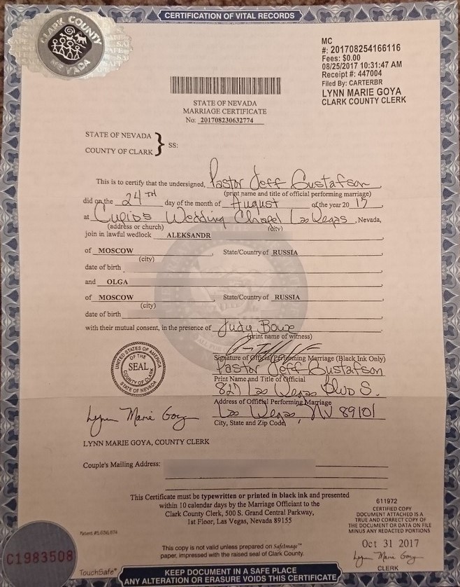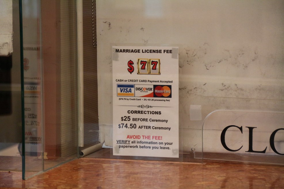 За эти деньги нам дали целый ворох бумаг и памятку, в которой сообщалось, что Лас-Вегас является ни много ни мало столицей всего мира для бракосочетаний: