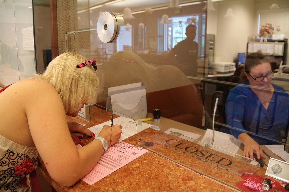 На входе висит объявление, что лицензию на брак не дают лицам, находящимся в пьяном виде или под действием наркотиков. Нижняя строка убедительно просит «Возвращаться после того, как протрезвеете»: