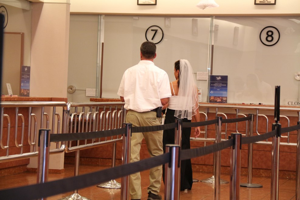 Офицер на входе очень удивился нашему приходу, и с улыбкой сообщил, что мы пришли в окружную тюрьму. Сдавать свою будущую жену в американскую тюрягу в мои планы не входило, и мы пошли дальше. Нужное нам бюро находилось совсем рядышком: