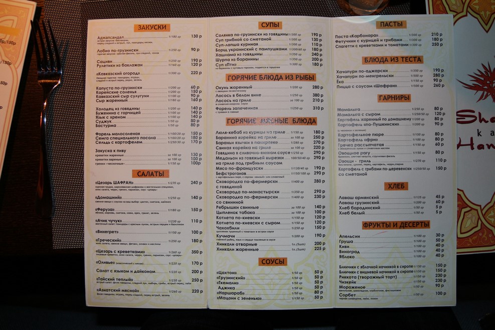 Найти в Сочи невкусную еду очень сложно. Мы в основном ходили есть в близлежащий с гостиницей торговый центр. Там была отличная кафешка. Что бы прикинуть цены, выкладываю меню: