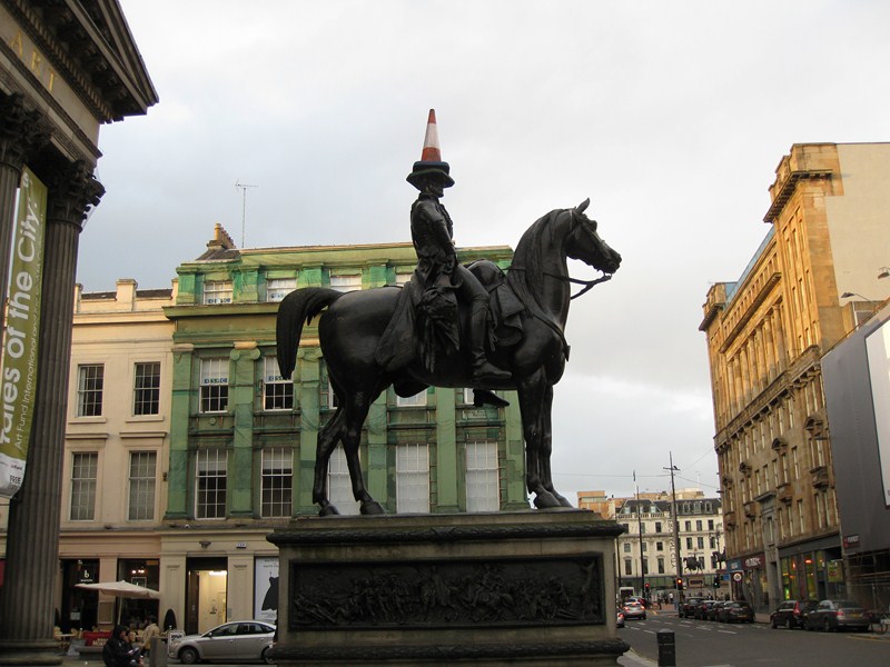 На памятник местному генералу молодежь всегда выдворяет дорожный конус. Коммунальщики снимают его днем, но на следующее утро конус снова на своем месте: