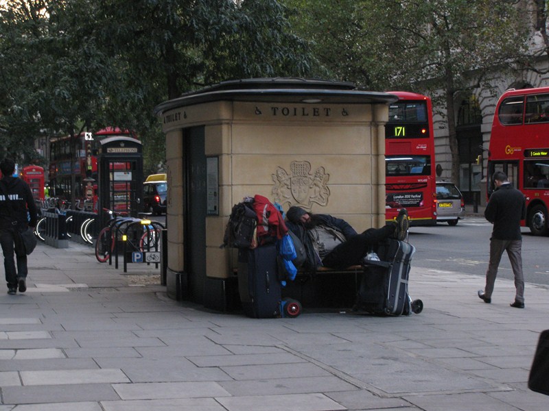 Бомж около туалета: