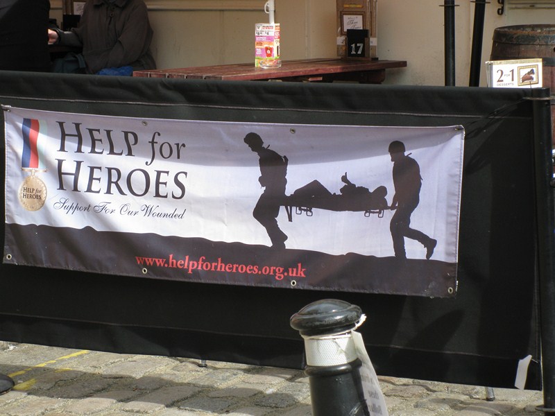 А на этом плакате «помоги героям» вы можете увидеть очевидно того самого героя. Ему только что отхерачело пол ноги, но он весел и доволен, и поднимает палец, мол, это самое крутое, что было в моей жизни: