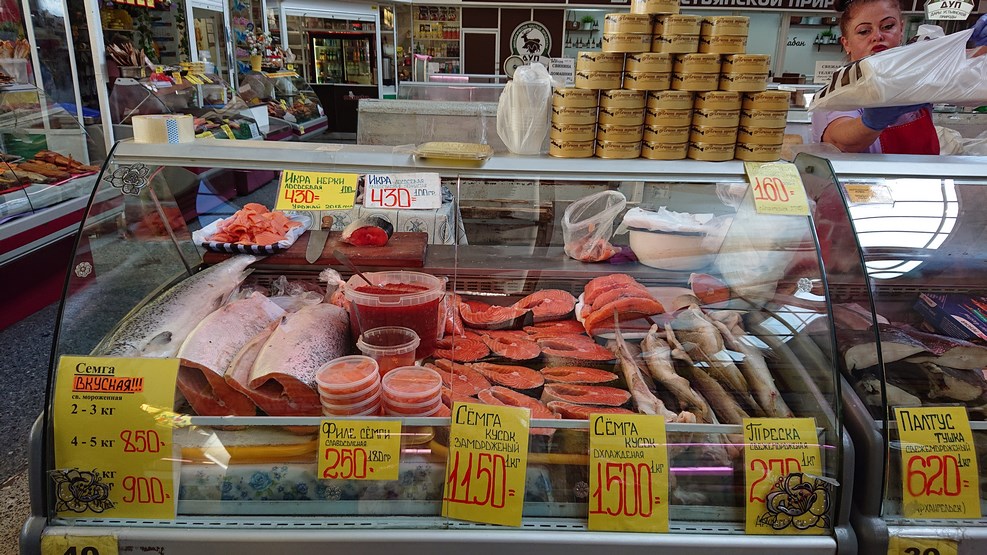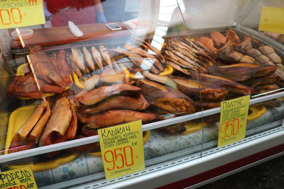 Рыбный рынок в центре города. Товары и цены: