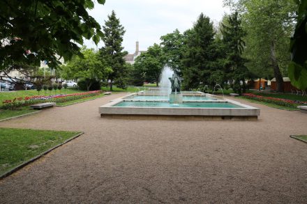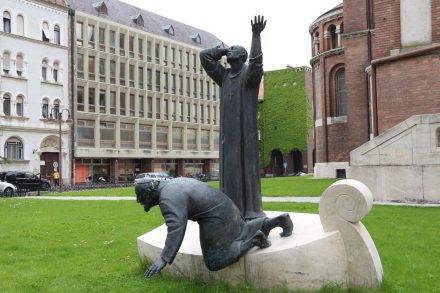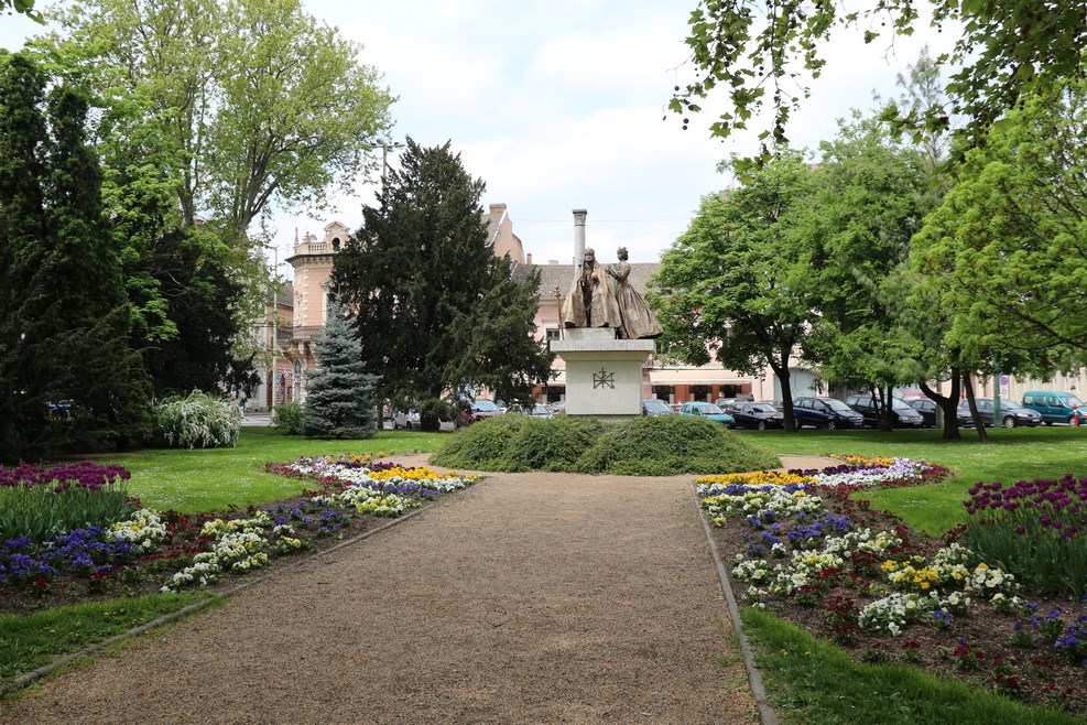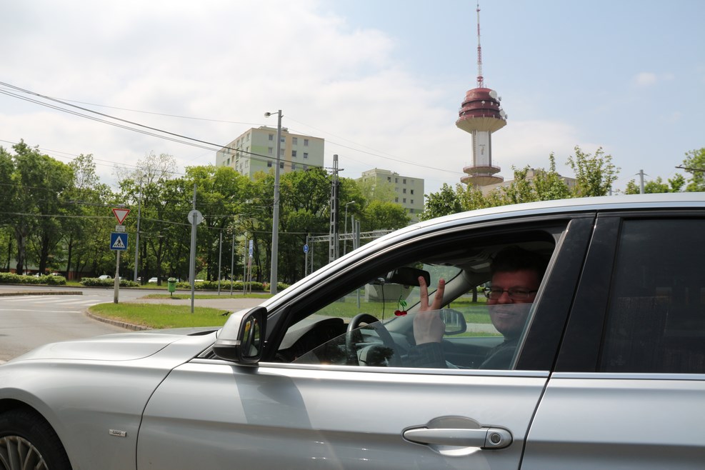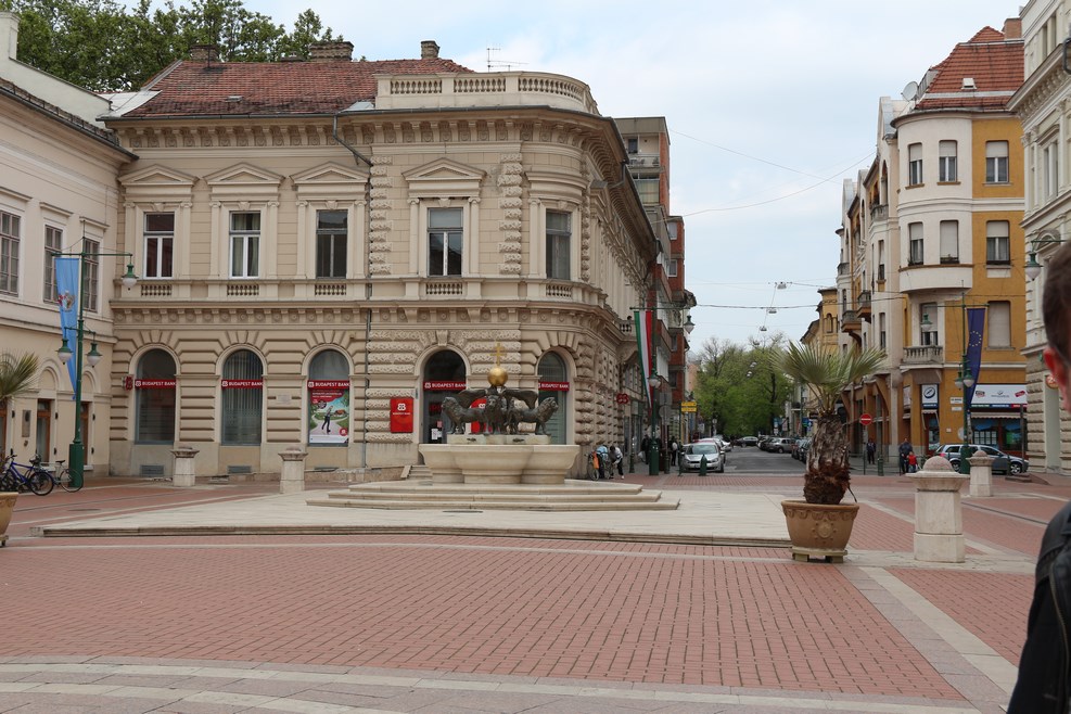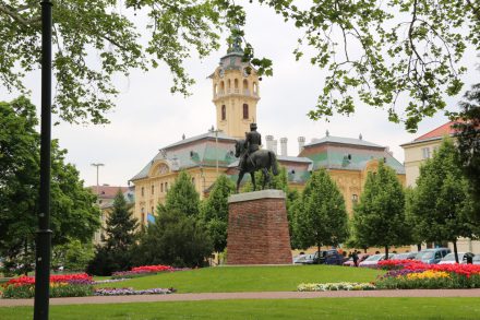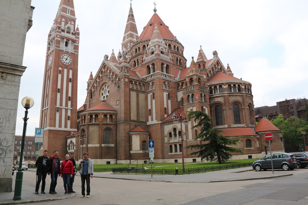 Приехали в город Сегед. Он находится около границы трех государств – Венгрии, Румынии и Сербии. Саня на фоне сегедской телевышки: