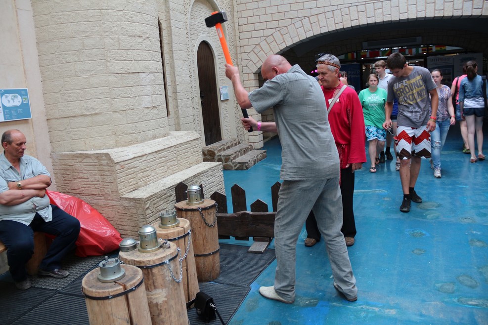 Мужик колошматил по болванке, внутри которой находилась железная заготовка. После крепкого удара на заготовке появляется чеканка. Попал мужик по болванке раза с пятого: