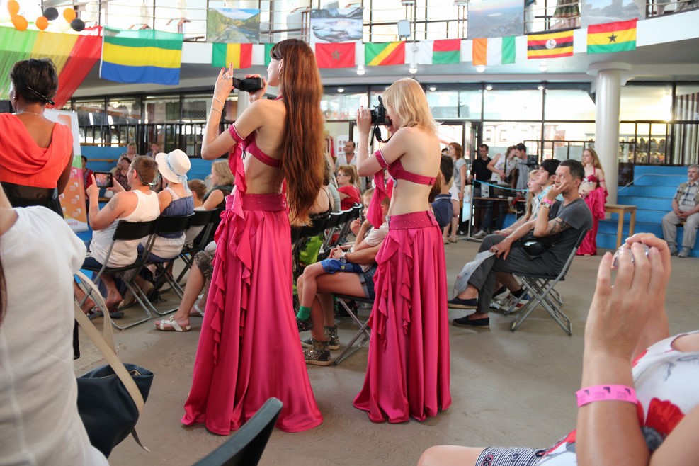 Проходим дальше. Танцовщица с “формами” преподает урок «танца живота»: