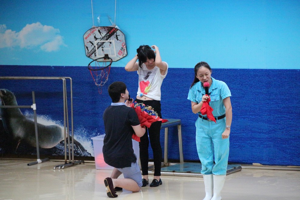 Дальше уж очень все стало похоже на постановку. На сцену вызвали девушку и парня. Им завязали глаза под предлогом очередного трюка с тюленем, но парень повязку сразу снял и ему дали в руки букет цветов. Потом ведущая попросила снять повязку и девушку, и парень ей сделал предложение: