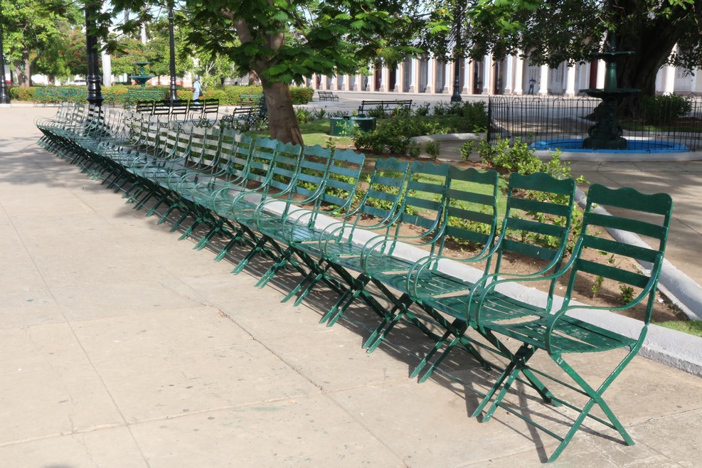 Спускаемся обратно, гуляем по городу. Вместо лавочек стулья, сваренные вместе: