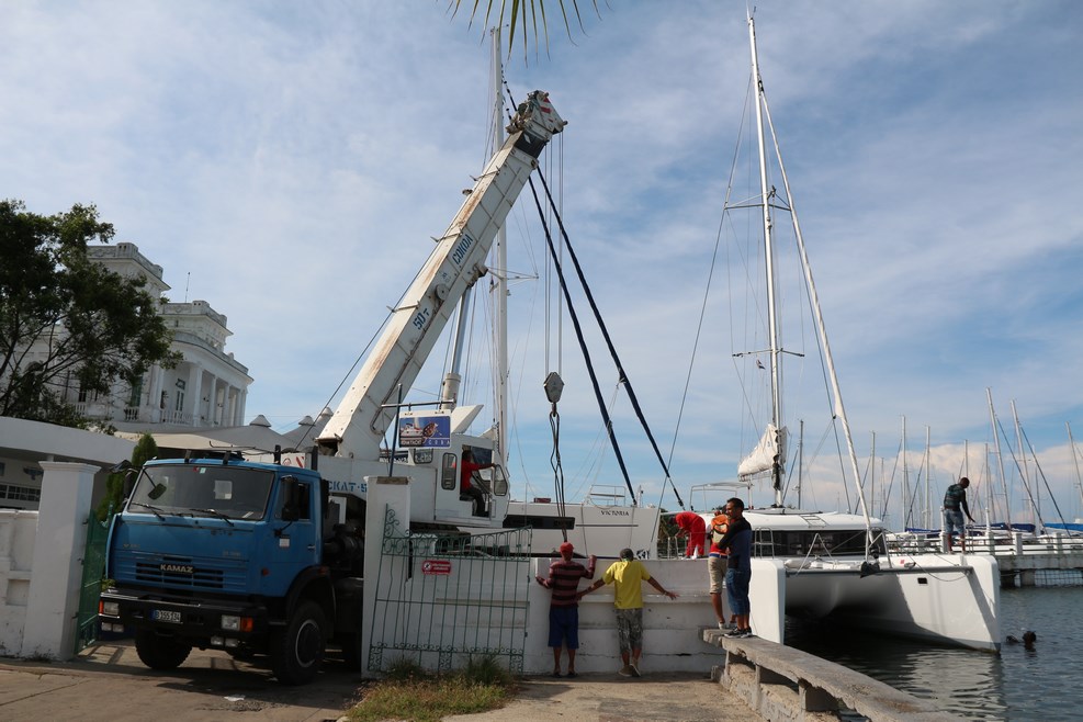 «Камаз» с краном «Сокол» помогает ремонтировать катамаран: