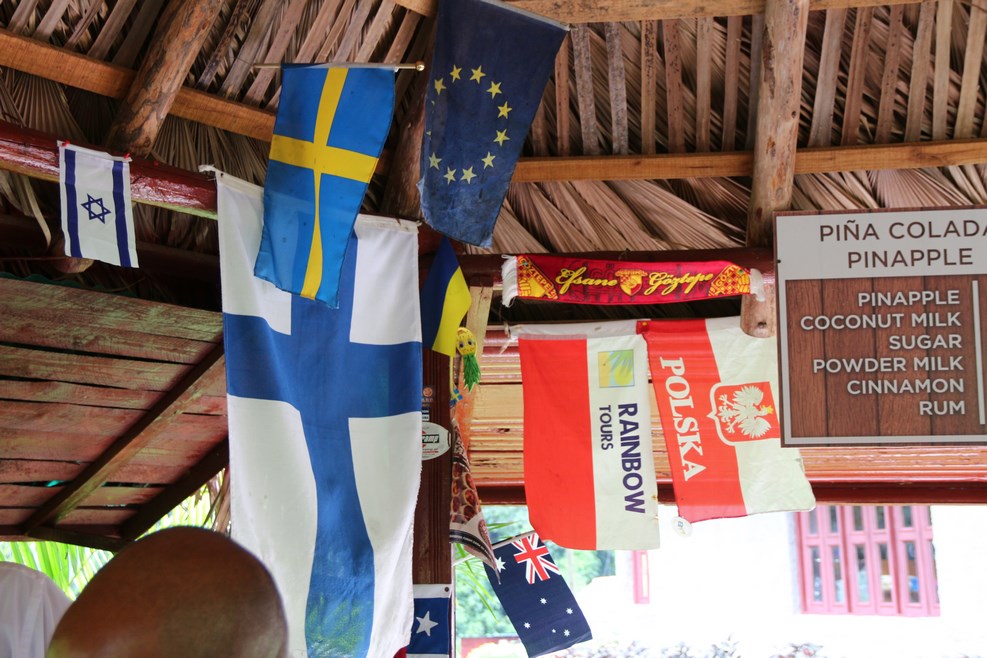 Пока люди гуляли, мы пили «Пина коладу» в местном баре. Флаги, оставленные посетителями, над барной стойкой: