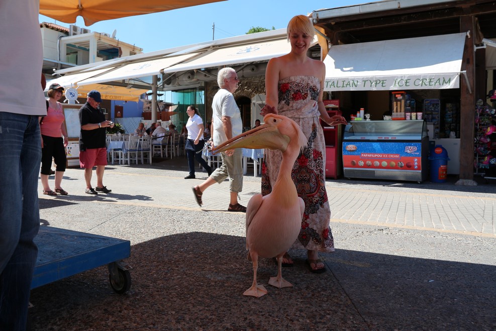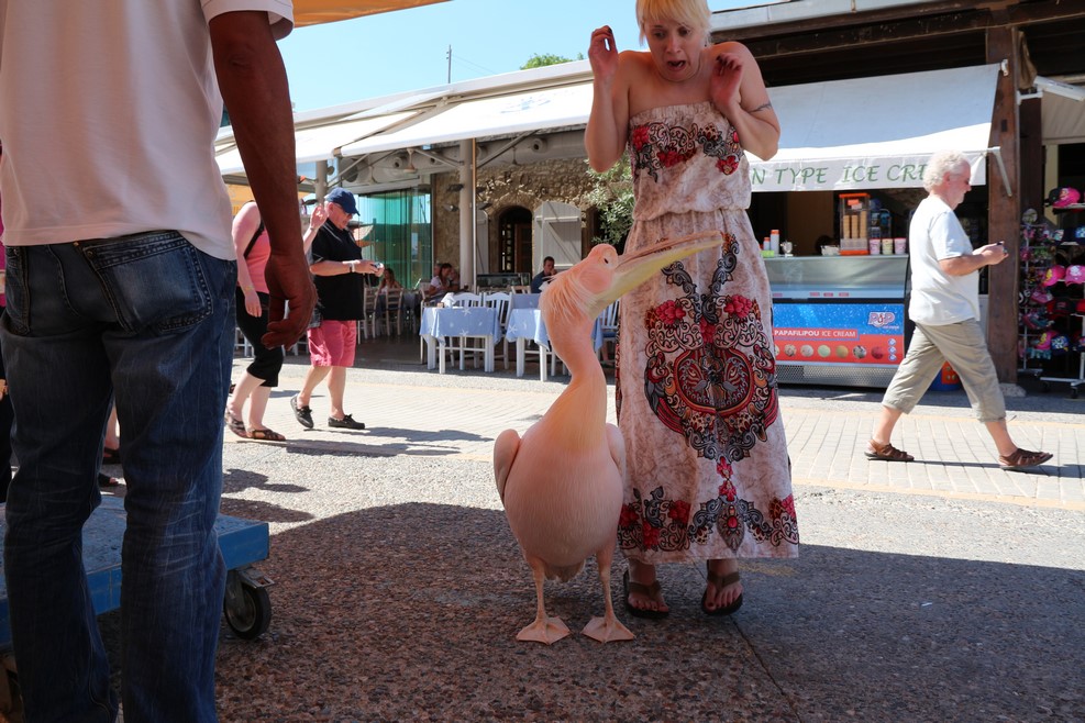 На набережную к одной из кафешек прилетает пеликан: