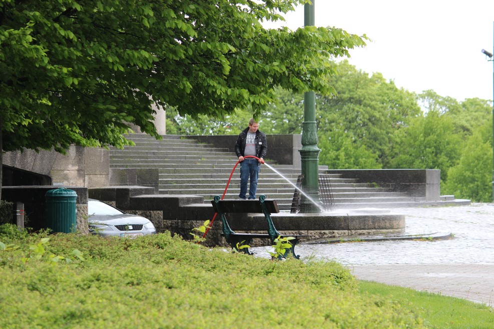 Идет дождь, но упорный дядька все равно моет асфальт: