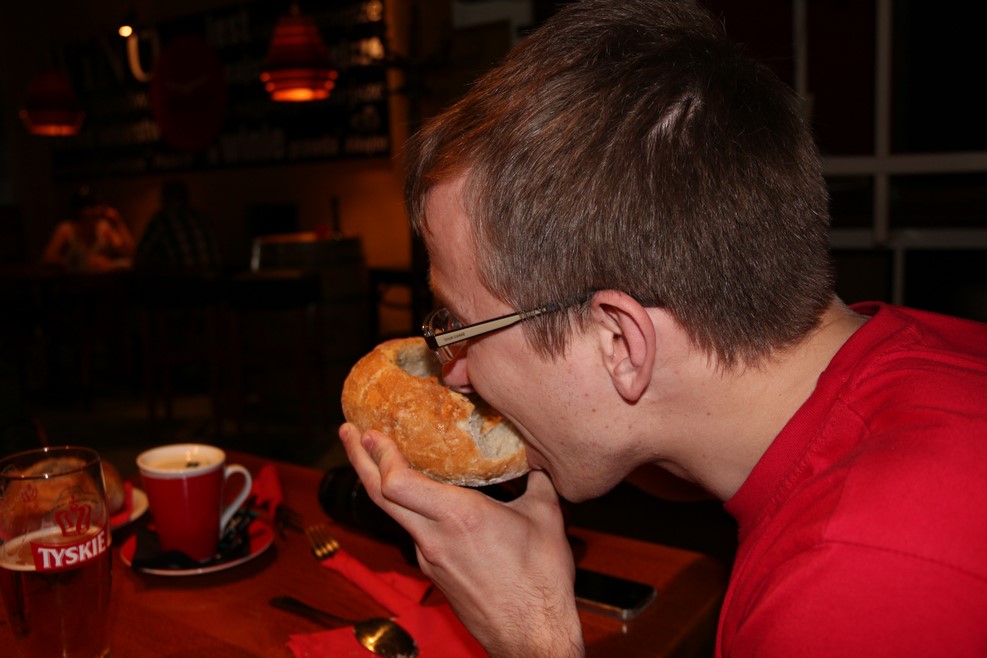 Паша доедает тарелку от блюда «Суп в хлебе»:
