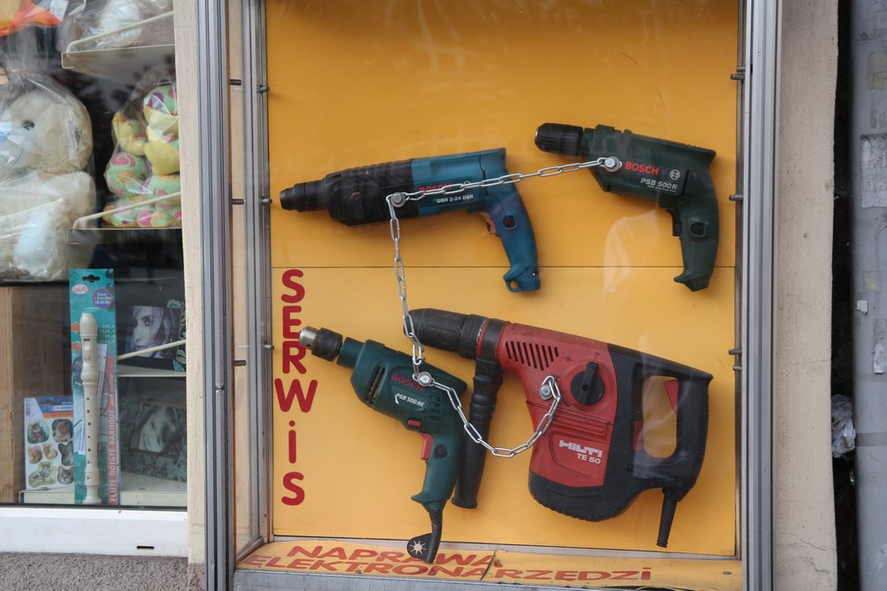 Чтобы дрели не сперли, их прикрепили цепочкой:
