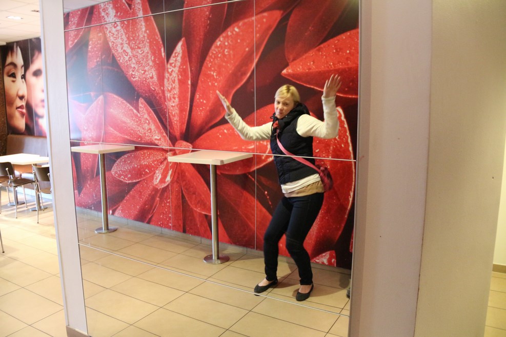 Кидаешь 5 крон, проходишь в туалет. Шведских крон у нас было совсем мало (мы ведь только что приехали из Дании, а там свои кроны), и мы нашли лишь один пятак на шесть человек желающих, который нам сдали как сдачу за проезд по платному Эресуннскому мосту. Так каруселькой, один за другим, не закрывая дверь при выходе полностью, и сходили в туалет на пятак. Единственным неудобством при этом было лишь отсутствие света в туалете. Олька развлекает нас в Макдаке танцами: