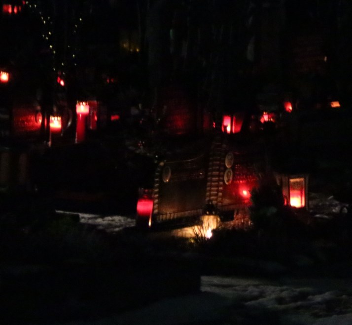 Около каждого надгробия горит по свечке, ночью получается очень красиво: