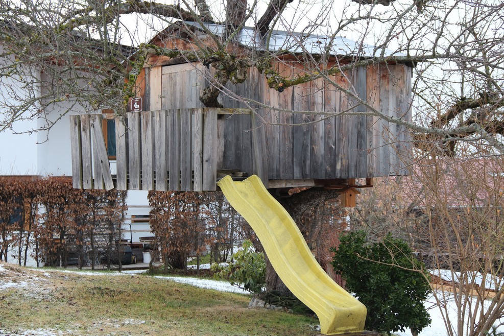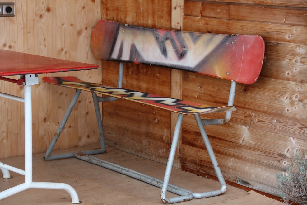 Напоминание о том, что рядом есть горнолыжные трассы. Лавочка из сноубордов: