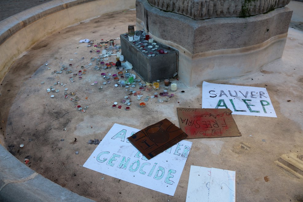 В неработающем фонтане стояли свечки и валялись плакаты, требующие остановить геноцид в Алеппо: