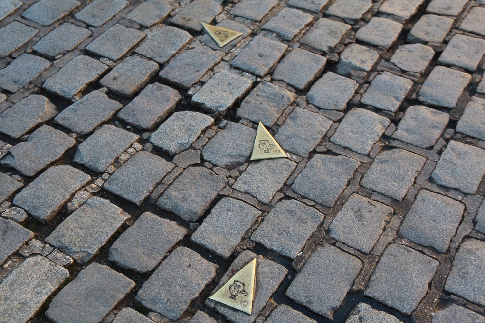 Приехали в центр. Все пешеходные маршруты по нему обозначены вот такими стрелочками, надо просто идти по ним:
